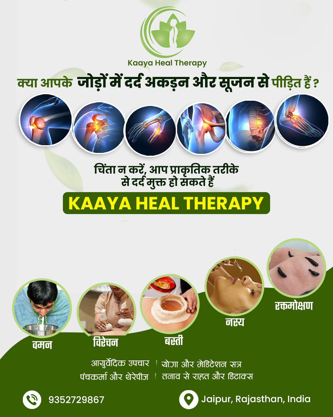 Do you suffer from joint pain, stiffness, or swelling? Kaaya Heal Therapy provides safe and effective Ayurvedic solutions for conditions like Knee Pain, Back Pain, Shoulder Pain, Neck Pain, Joint Stiffness & Muscular Pain